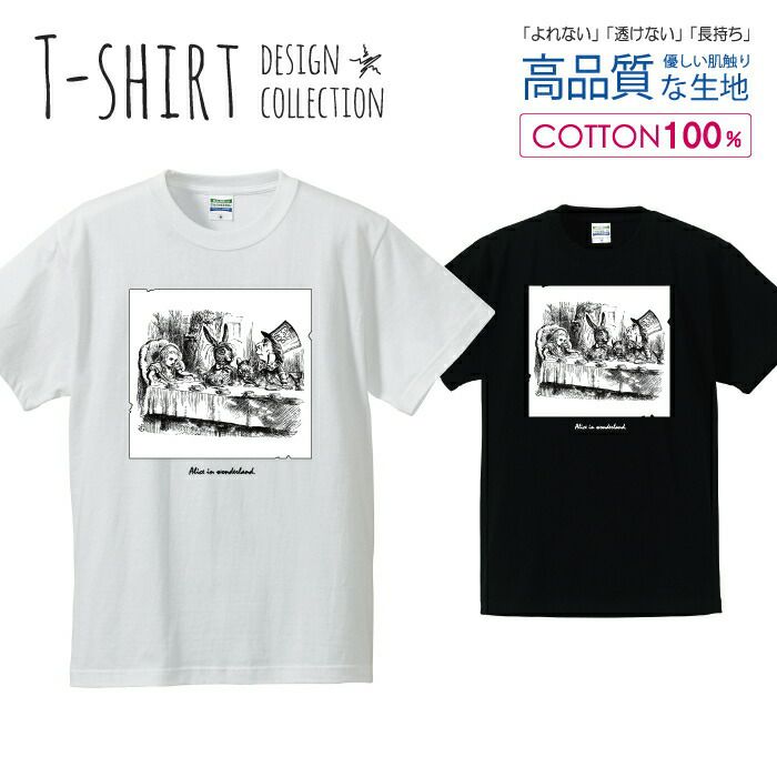 メンズ Tシャツ 不思議の国のアリス お茶会 イラスト 挿絵 白黒