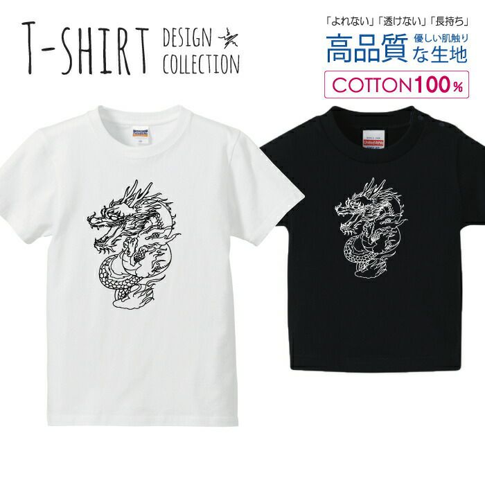 キッズ Tシャツ 龍 ドラゴン 竜神 イラスト 白黒