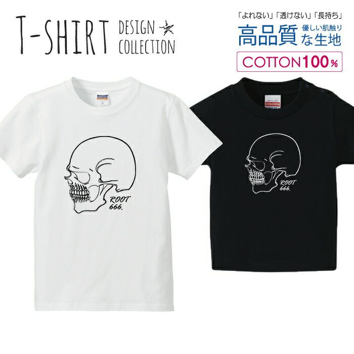 キッズ Tシャツ スカル36 ドクロ 髑髏 骸骨 横顔 ロック シンプル 白黒
