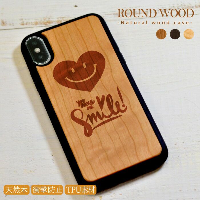 耐衝撃 木製スマホケース ウッドケース スマイル ハート